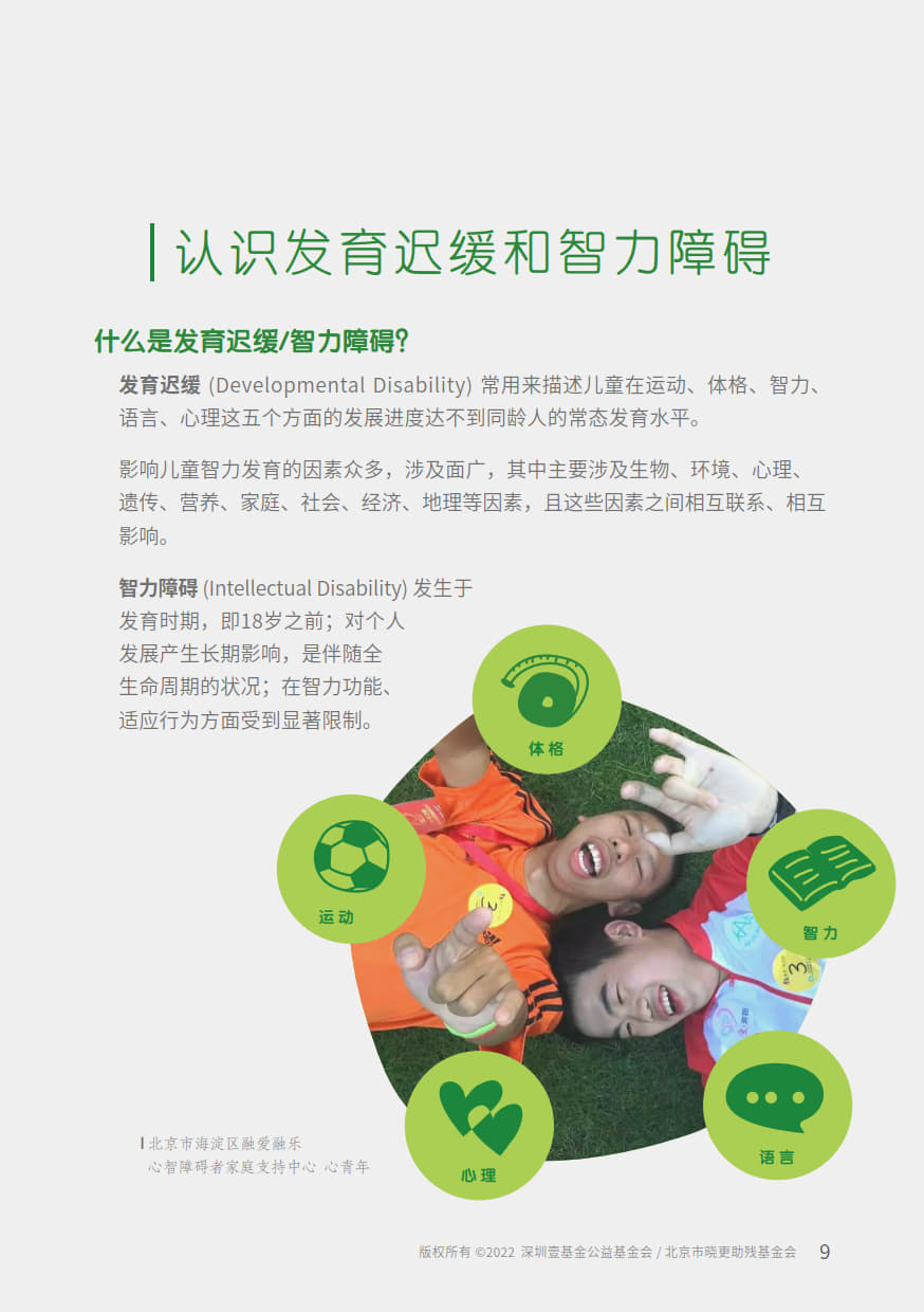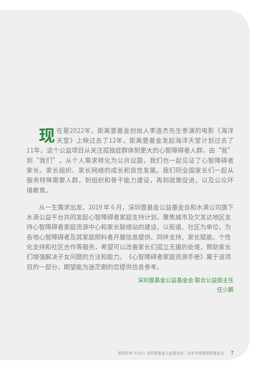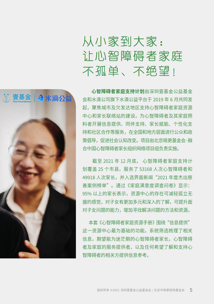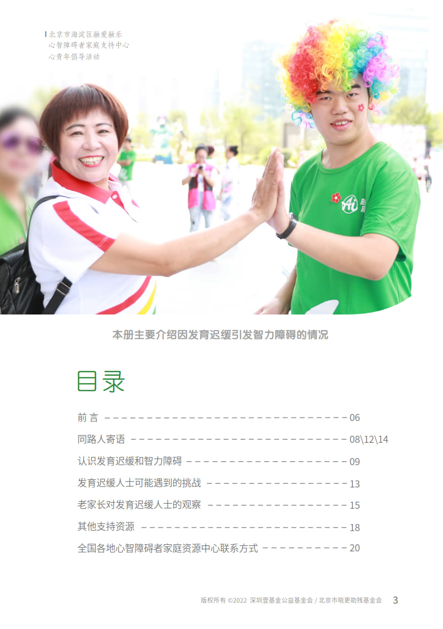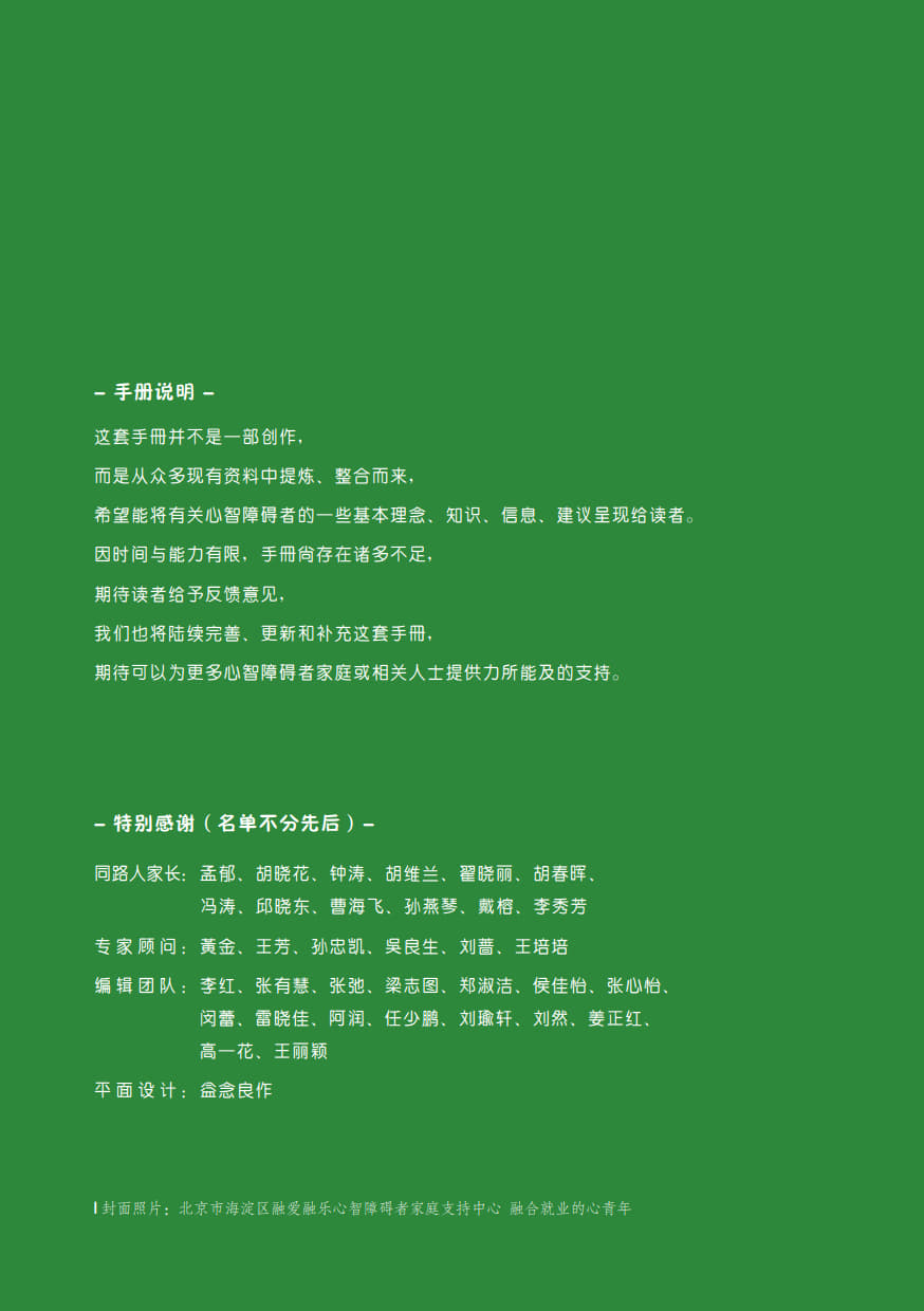 本手册由“壹基金心智障碍者家庭支持计划”公益项目资助,由北京市晓更助残基金会,融合中国心智障碍者家长组织项目网络,深圳壹基金公益基金会,北京市海淀区融爱融乐心智障碍者家庭支持中心联合开发,全国各地资源中心伙伴参与共创。