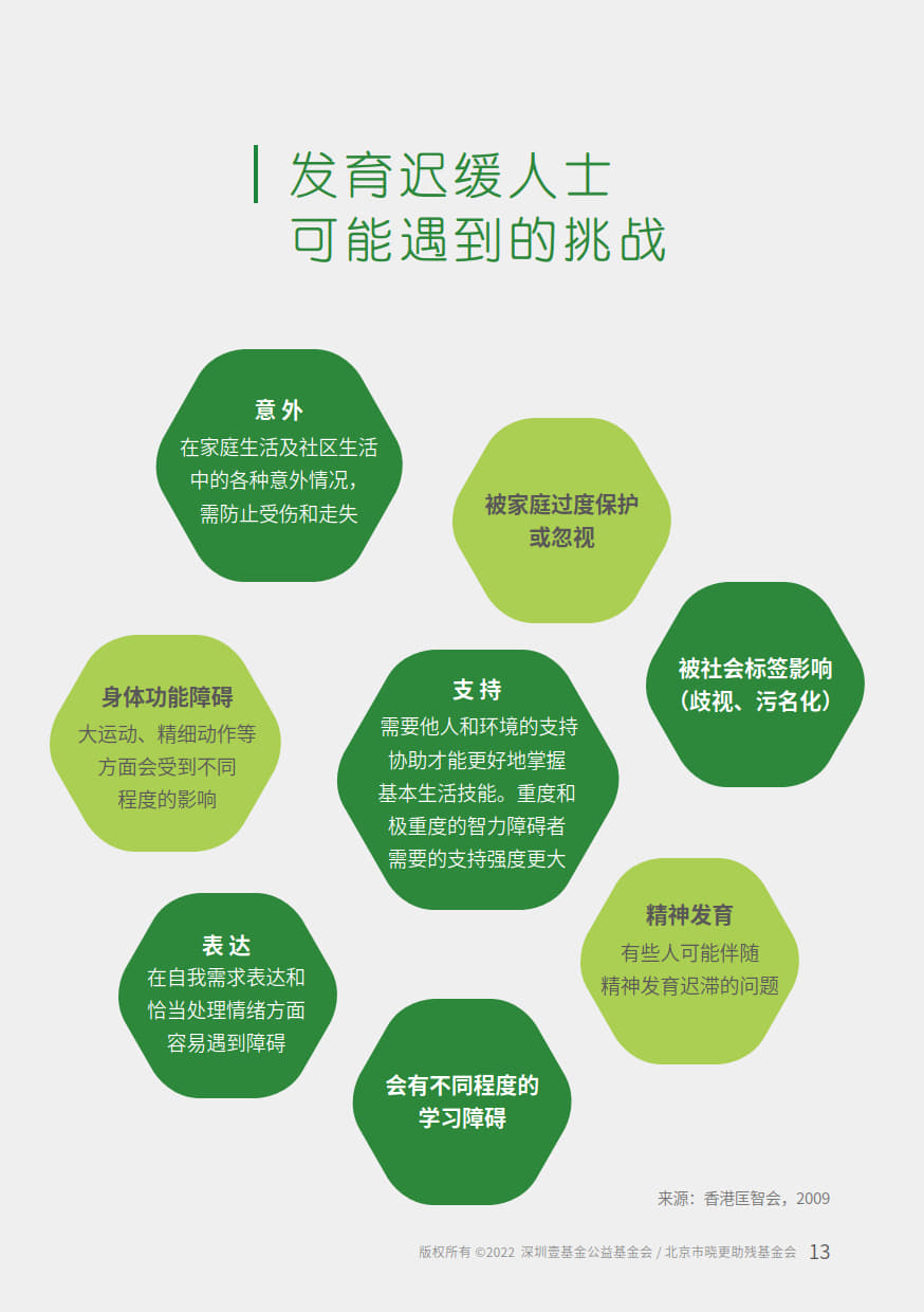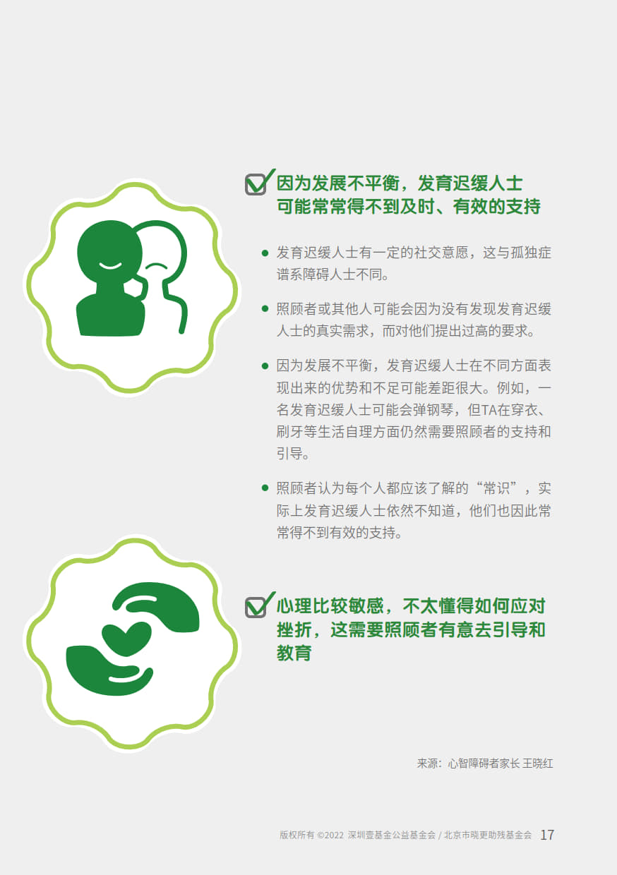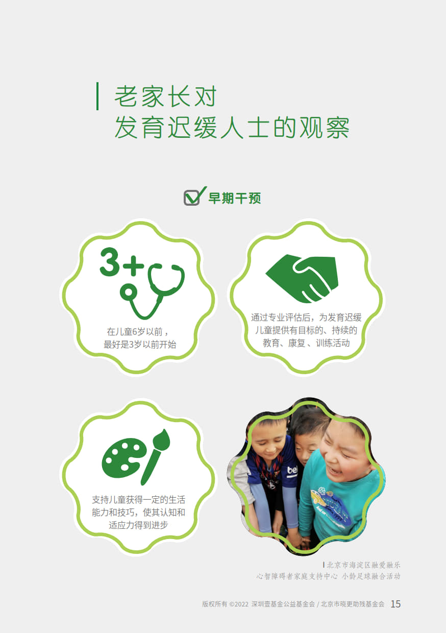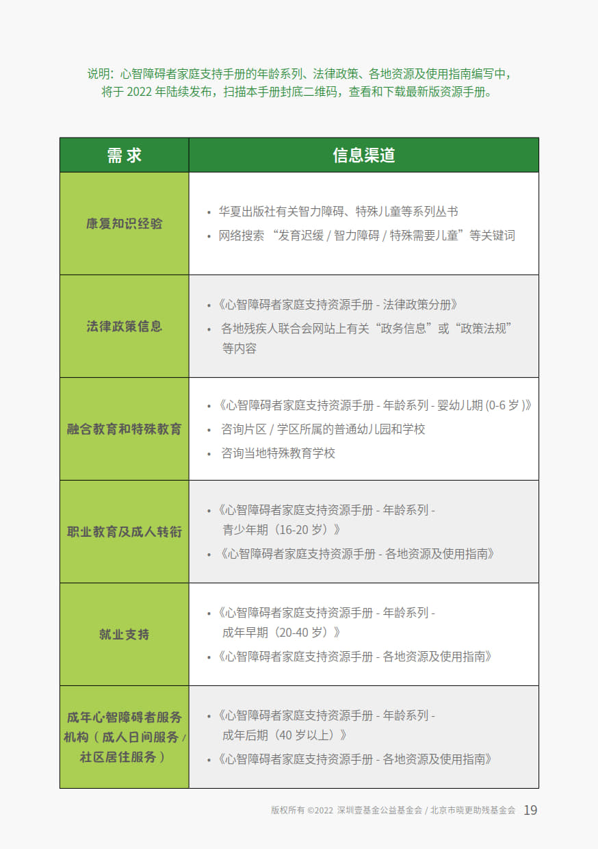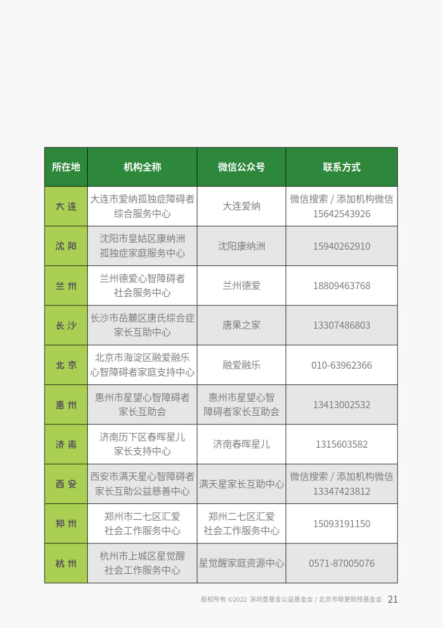 本手册由“壹基金心智障碍者家庭支持计划”公益项目资助,由北京市晓更助残基金会,融合中国心智障碍者家长组织项目网络,深圳壹基金公益基金会,北京市海淀区融爱融乐心智障碍者家庭支持中心联合开发,全国各地资源中心伙伴参与共创。
