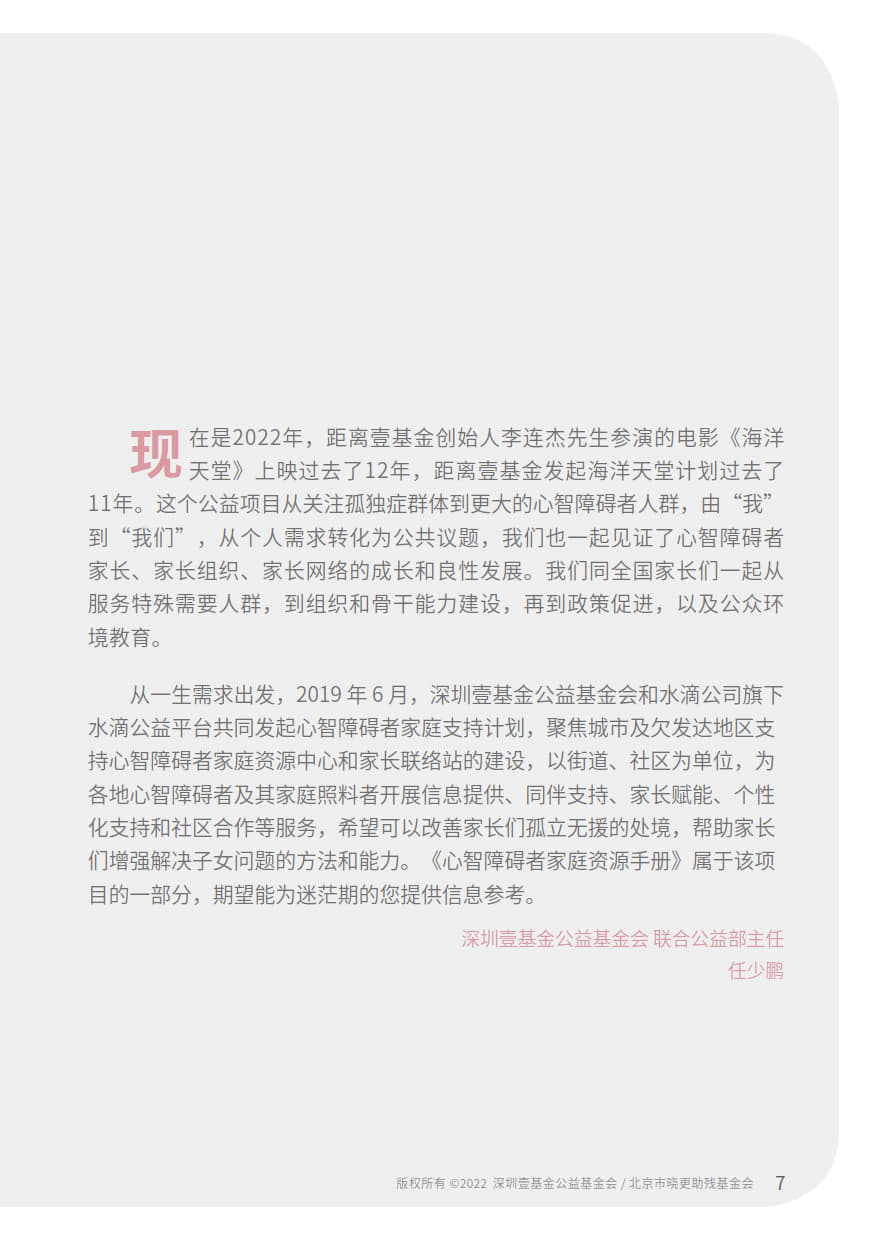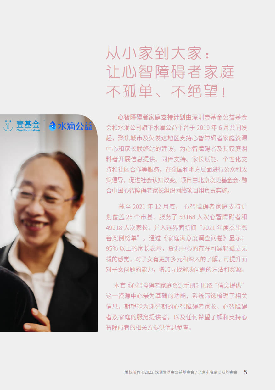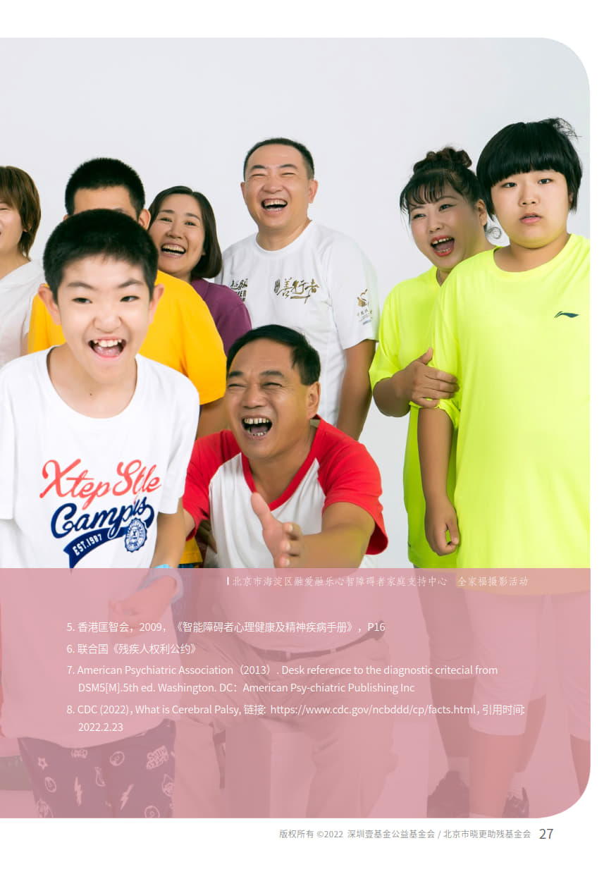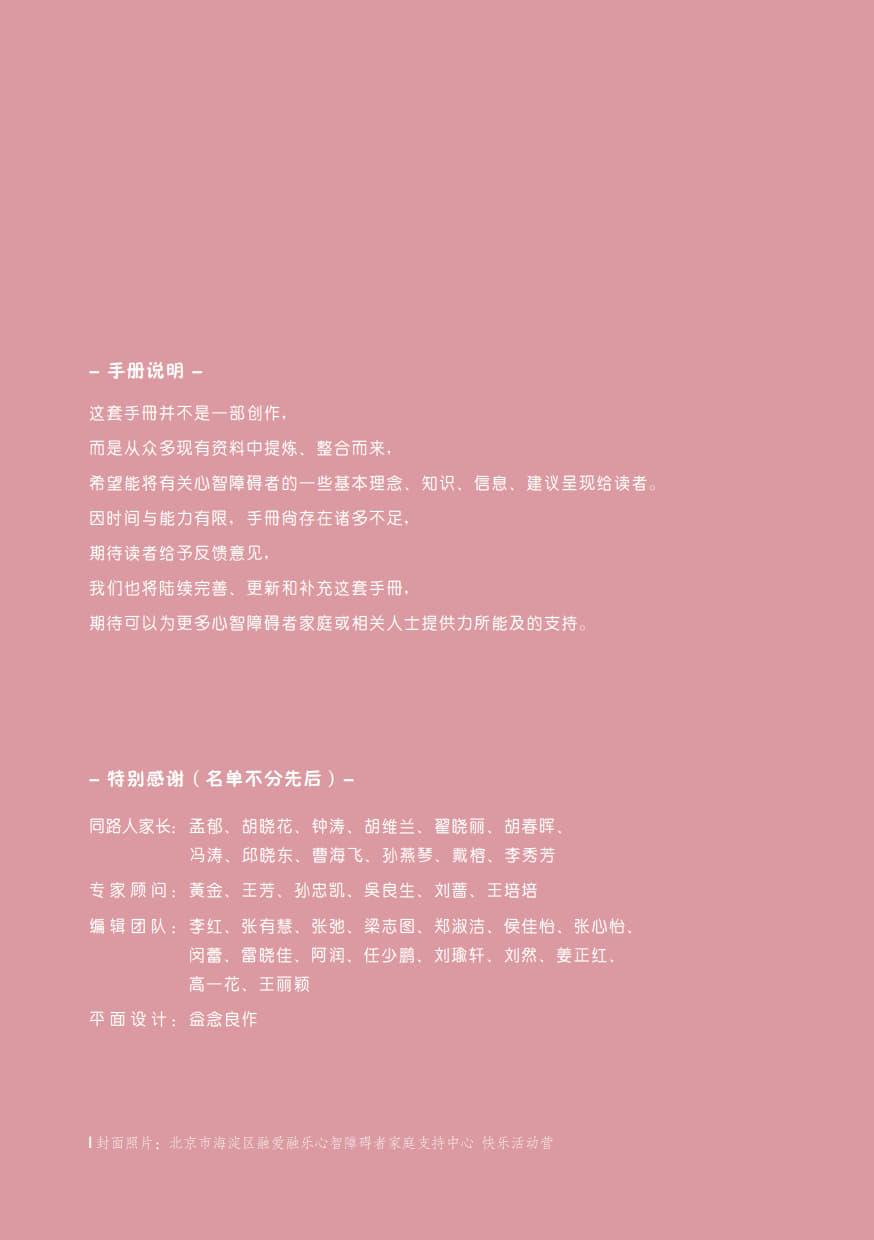 本手册由“壹基金心智障碍者家庭支持计划”公益项目资助,由北京市晓更助残基金会,融合中国心智障碍者家长组织项目网络,深圳壹基金公益基金会,北京市海淀区融爱融乐心智障碍者家庭支持中心联合开发,全国各地资源中心伙伴参与共创。