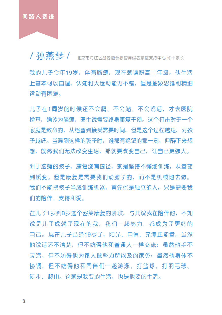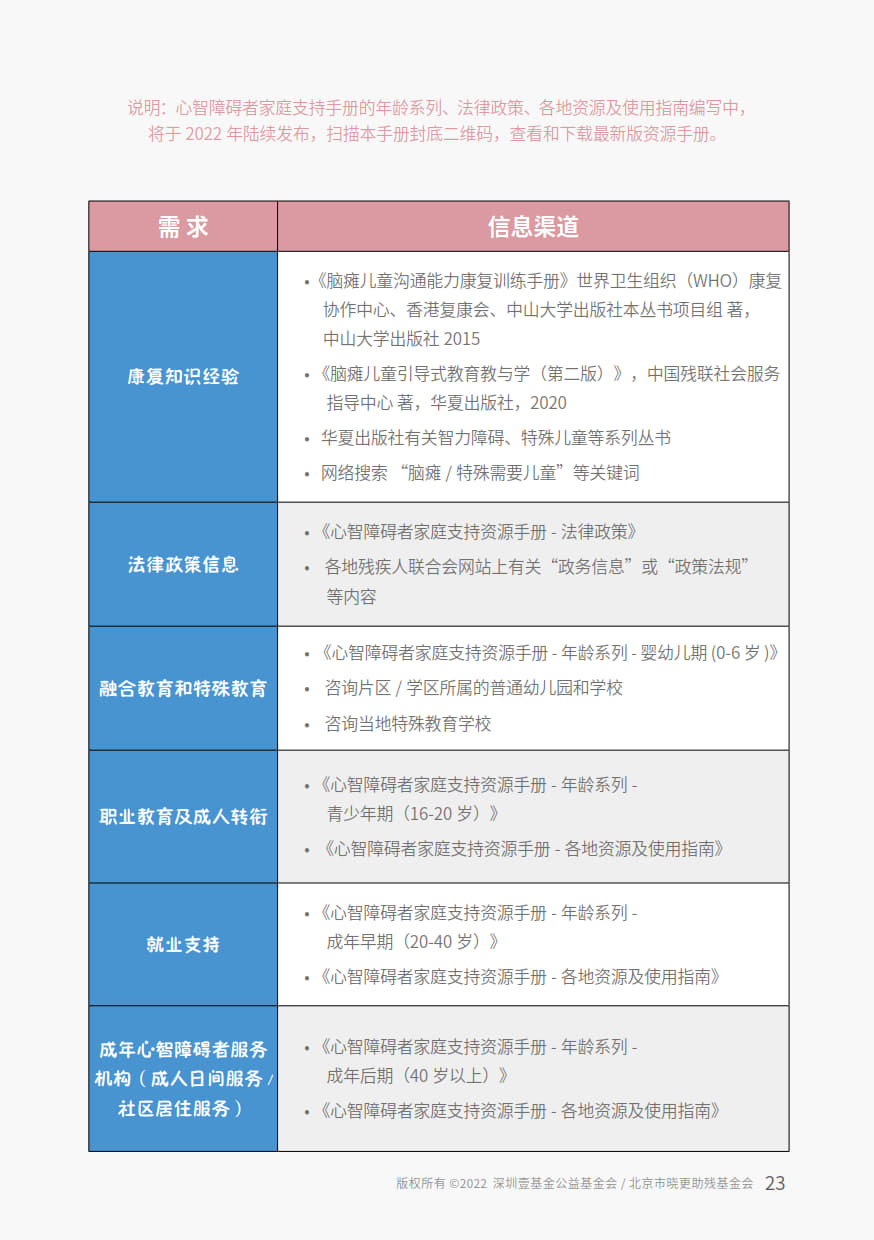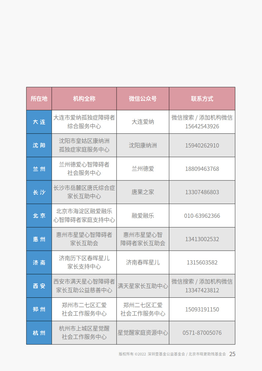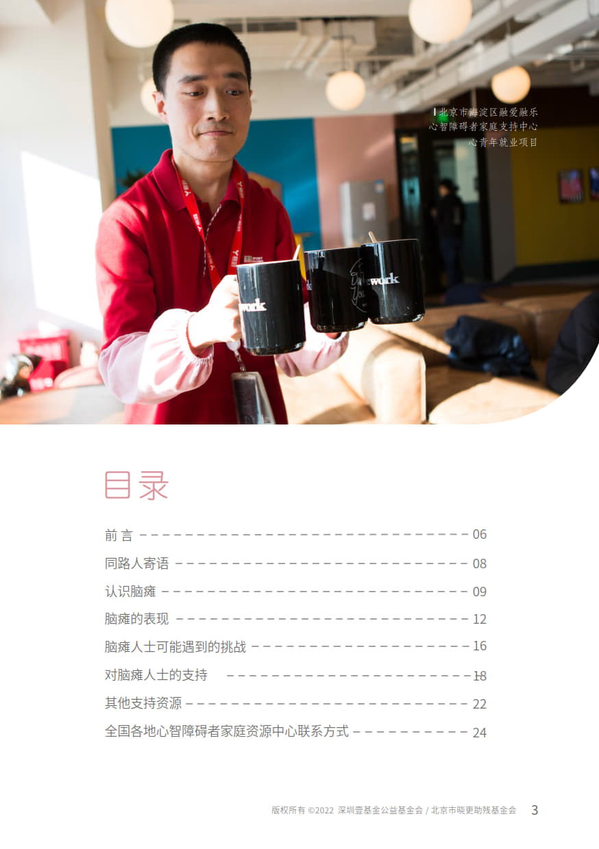 本手册由“壹基金心智障碍者家庭支持计划”公益项目资助,由北京市晓更助残基金会,融合中国心智障碍者家长组织项目网络,深圳壹基金公益基金会,北京市海淀区融爱融乐心智障碍者家庭支持中心联合开发,全国各地资源中心伙伴参与共创。